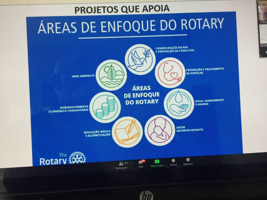 Na sequência contamos com a apresentação da Diretora de Protocolo Distrital do ano rotário 2021-2021, companheira Maria Leão tecendo considerações quanto as atribuições e responsabilidades dos ocupantes da função de Protocolo junto aos Clubes. Após houve a apresentação da companheira Tammy Romaguera Silva, responsável no Distrito pela Comissão de Serviços à Juventude, com ênfase na apresentação dos programas, habilitações e encargos de responsabilidade dos clubes. A Comissão de Desenvolvimento do Rotary, antiga Comissão de Desenvolvimento do Quadro Associativo - DQA foi apresentada pela companheira Maria Gorethi Lussoli, quando abordou as estratégias, objetivos e metas para a retenção e crescimento de nossa organização. Abrilhantando este treinamento tivemos as participações das jovens Loriane Heide e Eduarda Bicca representantes do Rotarct e Interact que narraram quanto aos benefícios dos Rotary Clubes em apoiar e apadrinhar os Rotarct e Intercact. Já na Comissão da Fundação Rotária contamos com as participações dos companheiros Governador Jorge Franco e Sandra Lara abordando a história, ações, programas e recursos da Fundação Rotária de Rotary International. Na Comissão de Imagem Pública, a companheira Rafhaela Caçapava buscou incentivar os presidentes a refletirem como seus clubes são vistos pela comunidade em geral, disponibilizando várias técnicas e conceitos para o desenvolvimento das Comissões de Imagem Pública dos Clubes. Para a Comissão Distrital de Administração contamos com o companheiro Governador Ernani Brescianni que discorreu sobre as Técnicas de Liderança, os Elementos de um Rotary Eficaz, Plano de Lideranças de Clubes – PLC, Assembleias de Clubes e a importância do Planejamento, Organização, Coordenação, Comando e Controle. Finalizando as apresentações contamos com a companheira Rosemari Pavan Rattamann responsável Distrital pela Comissão de Projetos abordando os projetos distritais nas sete áreas de enfoque, isto é, consolidação da paz e prevenção de conflitos; prevenção e tratamento de doenças; água, saneamento e higiene; saúde materno-infantil; educação básica e alfabetização; desenvolvimento econômico comunitário; e meio ambiente.