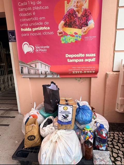 Na continuidade das atividades do segundo semestre do ano rotário 2025-2026, foi efetuada a terceira entrega, do ano de 2026, de materiais recicláveis e donativos (tampinhas plásticas, roupas, calçados e remédios) do Rotary Club de Curitiba Guabirotuba ao Asilo São Vicente de Paulo, na data de 14/02/26.